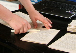 Wer gedacht hat, das Korrekturlesen sei die Aufgabe, die die meiste Konzentration verlangt, dem muss ich widersprechen. Bevor die Geschichte endlich ausgedruckt werden kann, um dann mit dem „richtigen“ Buchbinden zu beginnen, muss man sie zum Ausdrucken neu sortieren. Wieso das? Weil beim klassischen Buchblock Seite 1 zum Beispiel keinesfalls neben Seite 2 liegt, sondern neben Seite 16. Ich werde weiter unten noch erklären, woran das liegt. Jedenfalls erstellt man sich am Besten eine Tabelle mit der Reihenfolge, in der sortiert werden muss. Falls es ein Programm gibt, was diese lästige Umsortierung übernimmt, habe ich es bisher nicht ausfindig machen können. So bleibt mir nur, Seite für Seite einzeln aus dem ursprünglichen Text heraus zu kopieren und an der entsprechenden Stelle in einer neuen Datei einzufügen. Der wichtigste Befehl bei diesem Arbeitsschritt ist auf jeden Fall das „Gehe zu“ (Strg+G), ohne dass man ewig und drei Tage mühsam auf und ab scrollen müsste.