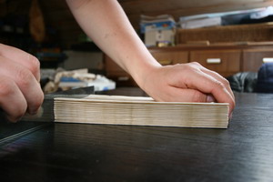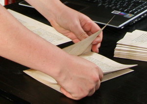 Ab jetzt ist tatsächlich handwerkliche Arbeit gefordert. Falls man ein Buch herstellen will, dessen Seiten noch leer sind, überspringt man die ersten 6 Arbeitsschritte und setzt gleich hier ein. Als Erstes muss jede Seite in der Mitte gefaltet werden, und damit sie möglichst flach liegen, wird die Kante mit dem Falzbein nachgezogen.