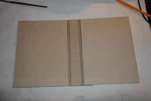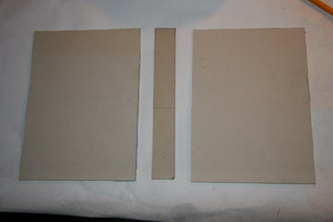 Der spätere Buchdeckel besteht aus drei Komponenten: Vorderseite, Rückwand und Rückseite. Für Vorder- und Rückseite verwende ich einen möglichst dicken Karton, zum Beispiel von sehr festen Geräteverpackungen. Mein Karton ist 5 Millimeter dick. Für die Rückwand wird dünnere Pappe verwendet, da diese elastischer sein muss. Gut eignet sich die Rückseite eines College-Blocks.