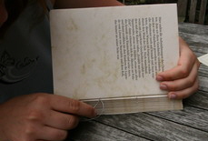 Hmpf, wie beschreibe ich diese Nähtechnik ohne passendes Bild? Eventuell liefere ich noch eins nach, jetzt müsst Ihr erst einmal mit der Beschreibung zurecht kommen. Man verwendet Buchbindergarn und eine stumpfe Nadel, die der Einfachheit halber idealerweise gebogen sein sollte.
